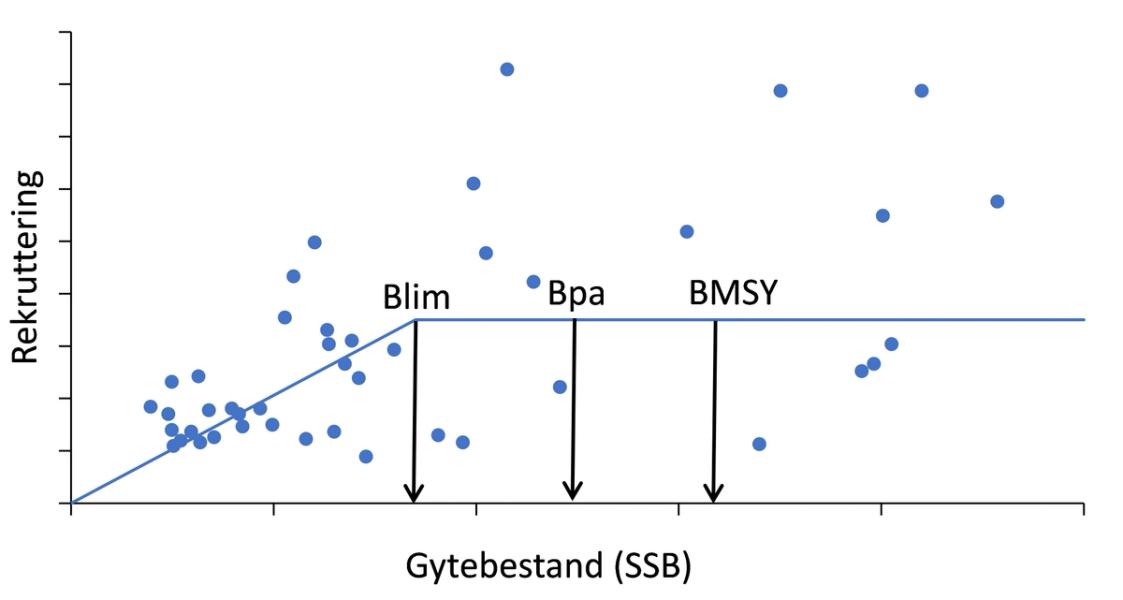 Figuren viser sammenhengen mellom gytebestand (SSB) og rekruttering (tilvekst) for en fiskebestand. Blå punkter er data, og den blå linjen representerer den estimerte sammenhengen. På linjen finner vi tre referanseverdier for bestanden; Blim, Bpa og BMSY. Når SSB er mindre enn Blim er det stor sannsynlighet for at rekrutteringen er negativt påvirket av en lav gytebestand. Når SSB er større enn Bpa er det liten sannsynlighet for at rekrutteringen er negativt påvirket. Når SSB er lik BMSY så er gytebestanden på et nivå som i gjennomsnitt vil gi det høyeste langsiktige uttaket (maximum sustainable yield). Figuren er omarbeidet fra ICES (2019).