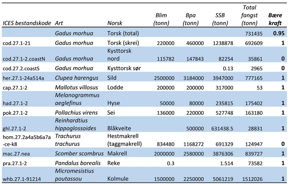 Bestandsvurderingene for Norskehavet og Barentshavet ble hentet fra ICES sin database. Vi brukte målene for gytebestand (SSB) og referanseverdiene Blim og Bpa for å angi bærekraft. Blim og Bpa er referanseverdier for «føre-var» vurderinger av bestanden. For en gytebestand mindre enn Blim er det stor sannsynlighet for at rekrutteringen er negativt påvirket av bestandsstørrelsen. I en slik situasjon er det fare for at bestanden kan kollapse. For en gytebestand større enn Bpa er det liten sannsynlighet for at rekrutteringen er negativt påvirket av bestandsstørrelsen, og dermed er det svært liten sannsynlighet for bestandskollaps.